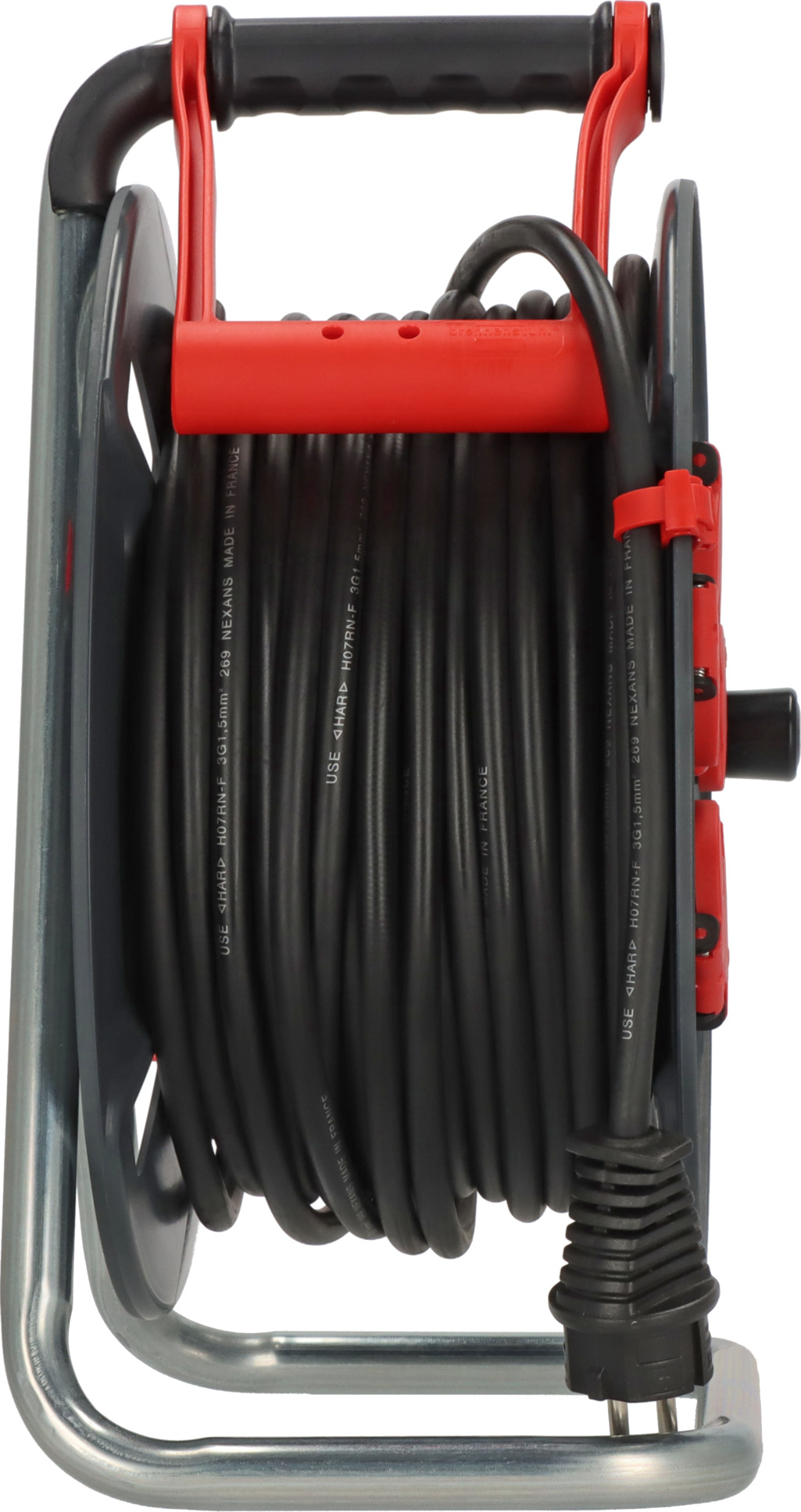 L’enrouleur de câble 300 KU 4101 Professional dispose de 40m de câble H07RN-F 3G1,5. Ce dérouleur électrique est doté de 5 prises de courant 16A/230V~ avec clapets à fermeture automatique muni d'un disjoncteur thermique central et d'un voyant de présence de tension qui évite les déplacements inutiles. De plus, ce dévidoir de câble est doté d'un bouton tournant et d'un clip de fixation du câble. La structure de l'enrouleur bénéficie d'ouvertures pour favoriser l'écoulement de l'eau, résistant aux chocs, conçue pour une utilisation intensive sur chantier, en intérieur comme en extérieur. Une poignée de transport "cablepilot" dotée de trous de rangement pour la fiche, d'un frein de tambour évitant le déroulement du câble durant le transport et les 5 prises de courant font de cet enrouleur de câble, fabriqué en France, l'accessoire indispensable de votre chantier.