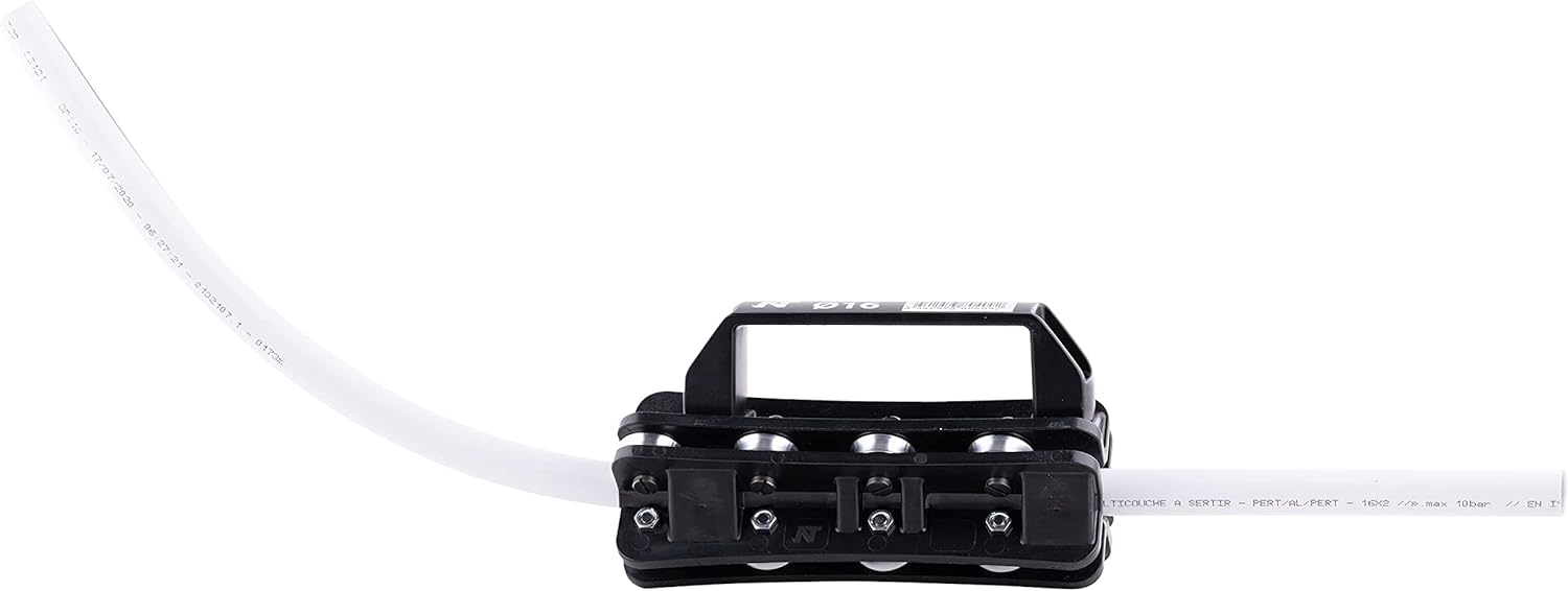 Le tube se glisse entre les galets métalliques du redresseur. Il suffit de faire coulisser le redresseur le long du tube Multicouche en effectuant quelques allers-retours pour obtenir une barre droite, prête à poser.