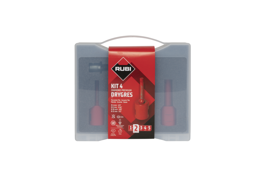 Le kit MINI DRYGRES PREMIUM est recommandé pour percer tous les types de carreaux de céramique, en particulier le grès cérame, et d'autres matériaux de revêtement tels que le marbre et le granit. Pour la conception des trépans du kit MINI DRYGRES PREMIUM, RUBI a utilisé la technologie VACUUM BRAZED, pour fixer les particules de diamant ; cette technoligie augmente la résistance à la température et au frottement.