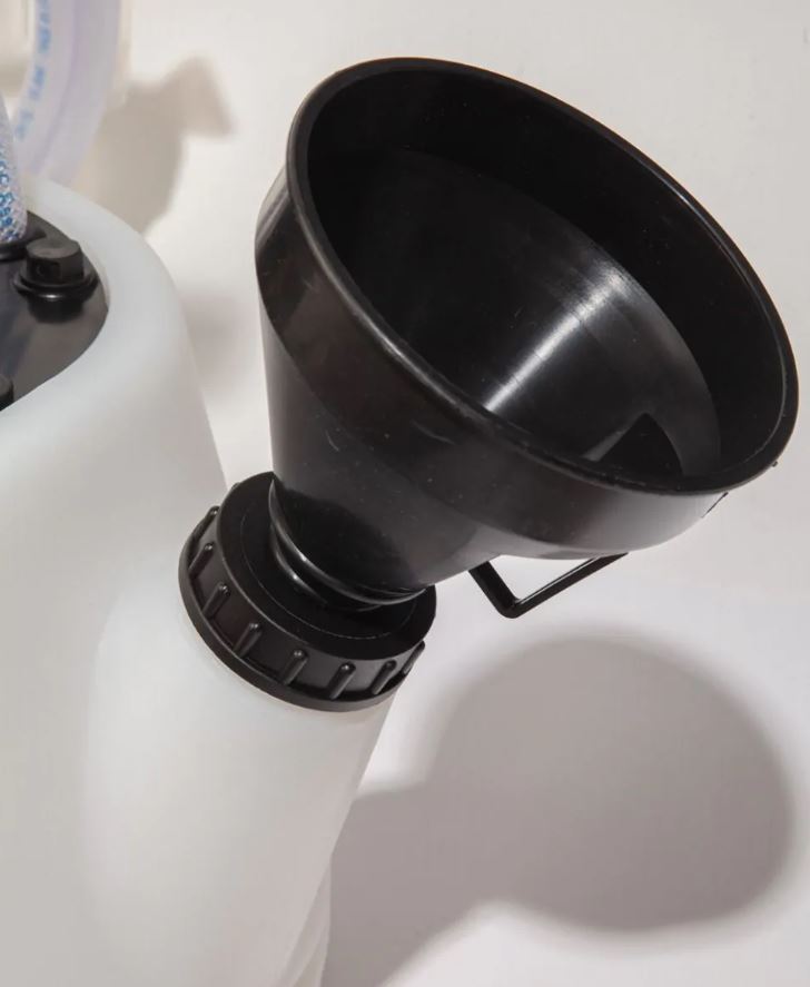 Entonnoir spécifique qui se visse à la place du bouchon pour faciliter le remplissage.